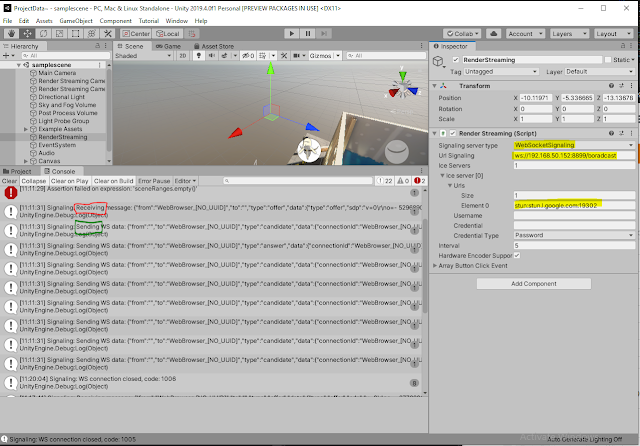 Unity 上的設定,可以直接打開專案中的範例場景,找到 RenderStreaming 物件,把 websocket signal 打開, ice server 資訊填上跟網頁上一樣的。
